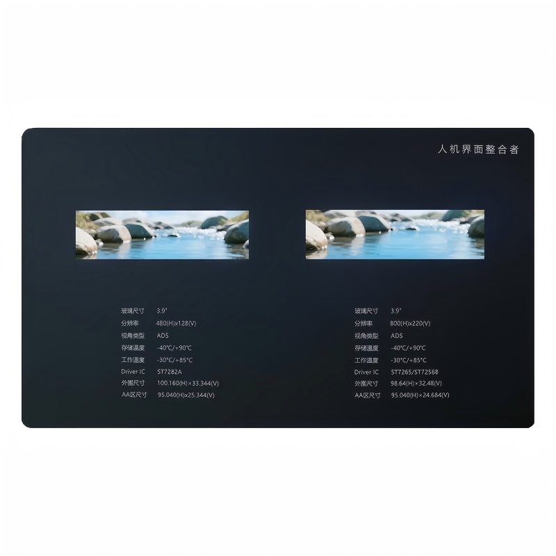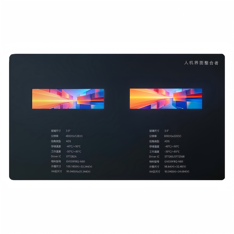 يتميز حل العرض المتكامل للغاية هذا بشاشة TFT مدمجة مقاس 3.9 بوصة مع منطقة نشطة (AA) تبلغ 95.040 (ارتفاعًا) × 25.344 (رأسًا) داخل إطار خارجي صغير يبلغ قياسه 100.160 (ارتفاعًا) × 33.344 (رأسًا). توفر وضوحًا حادًا بدقة 480 × 128، وتستخدم تقنية ADS لزوايا مشاهدة واسعة. تم تصميمه من أجل الموثوقية، فهو يعمل من -30 درجة مئوية إلى 85 درجة مئوية ويتحمل التخزين من -40 درجة مئوية إلى 90 درجة مئوية، مدعومًا بمحرك IC ST7282A للحصول على أداء قوي.