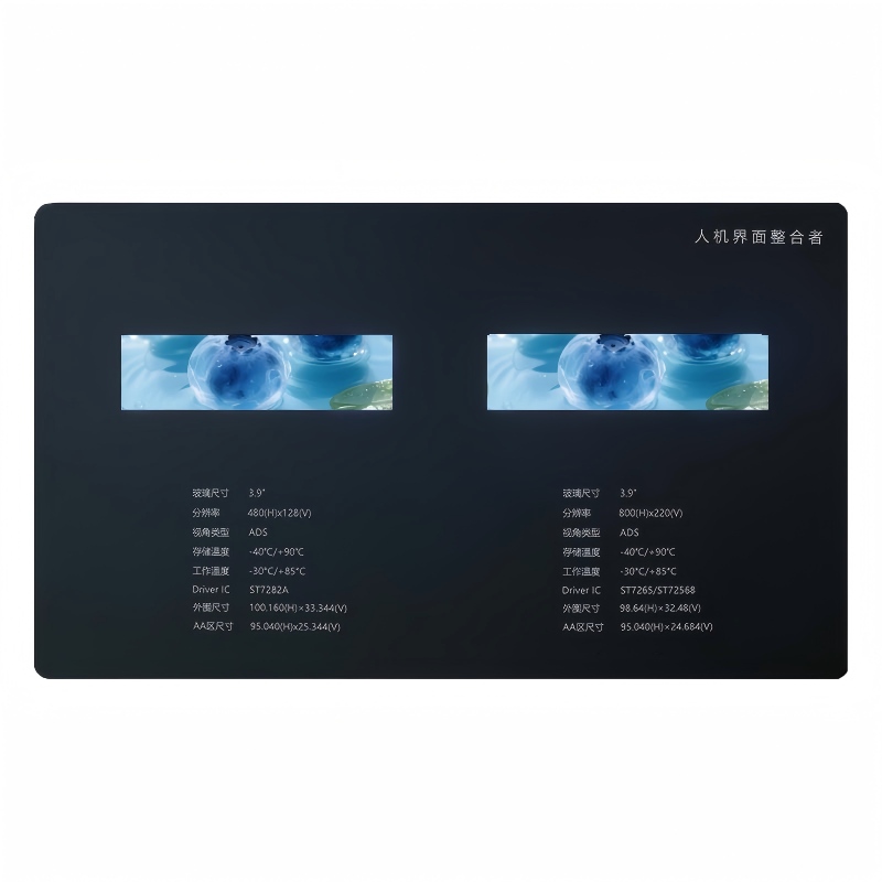 يتميز حل العرض المتكامل للغاية هذا بشاشة TFT مدمجة مقاس 3.9 بوصة مع منطقة نشطة (AA) تبلغ 95.040 (ارتفاعًا) × 24.684 (رأسًا) داخل إطار خارجي صغير يبلغ قياسه 98.64 (ارتفاعًا) × 32.48 (رأسًا). توفر وضوحًا حادًا بدقة 800 × 220، وتستخدم تقنية ADS لزوايا مشاهدة واسعة. تم تصميمه من أجل الموثوقية، فهو يعمل من -30 درجة مئوية إلى 85 درجة مئوية ويتحمل التخزين من -40 درجة مئوية إلى 90 درجة مئوية، مدعومًا بمحرك IC ST7265/ST72568 للحصول على أداء قوي.