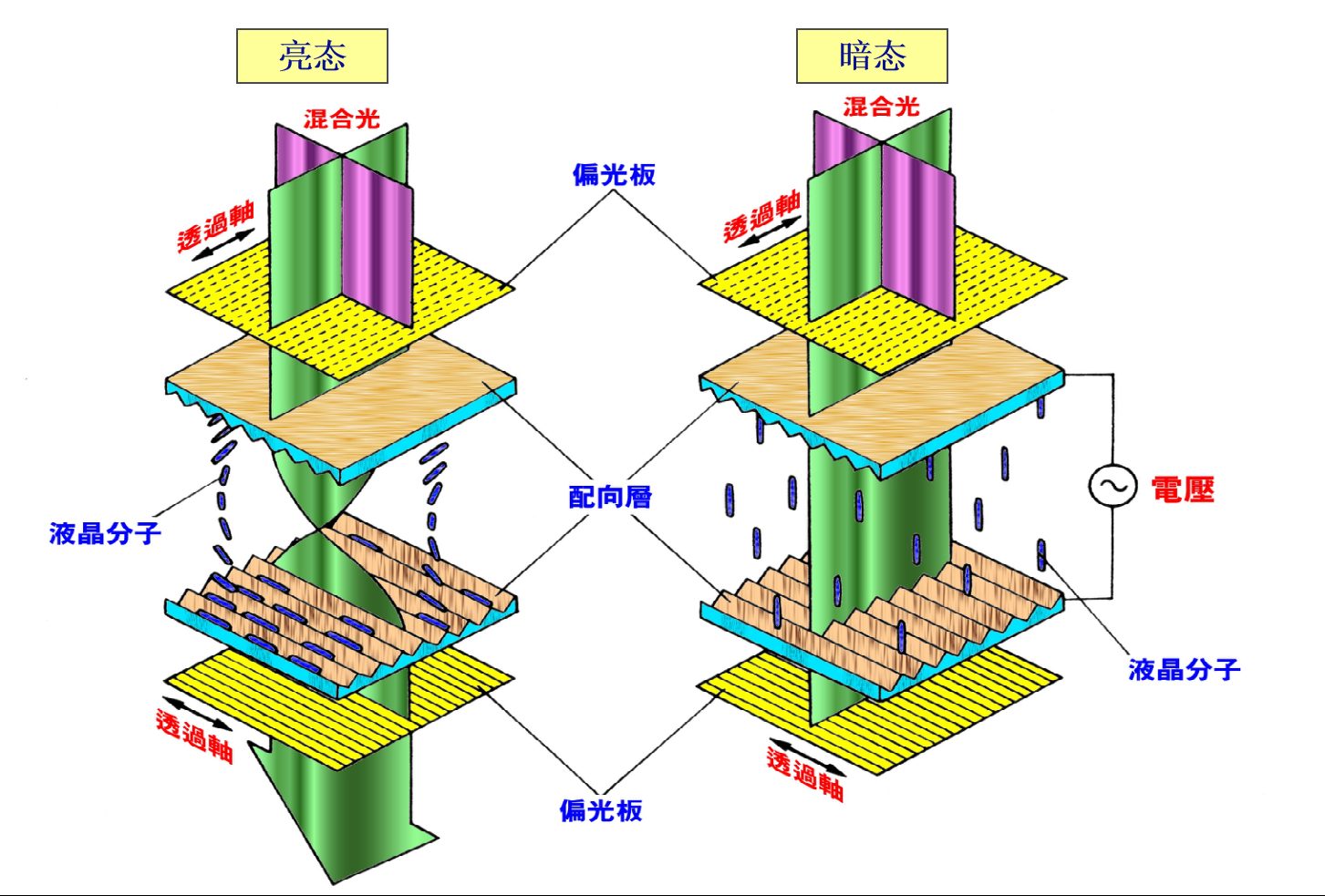 في الحالة الساطعة (حالة عدم العرض)، تحافظ جزيئات الكريستال السائل على ترتيب ملتوي منتظم بزاوية 90 درجة. يصبح الضوء الساقط مستقطبًا بعد مروره عبر محور نقل المستقطب الأمامي. عندما يمر هذا الضوء المستقطب عبر الطبقة البلورية السائلة، يدور اتجاه استقطابه بمقدار 90 درجة جنبًا إلى جنب مع البنية الملتوية الجزيئية، مما يتماشى مع المحور البصري للمستقطب الخلفي ويرسل من خلاله ليشكل الحالة الساطعة.